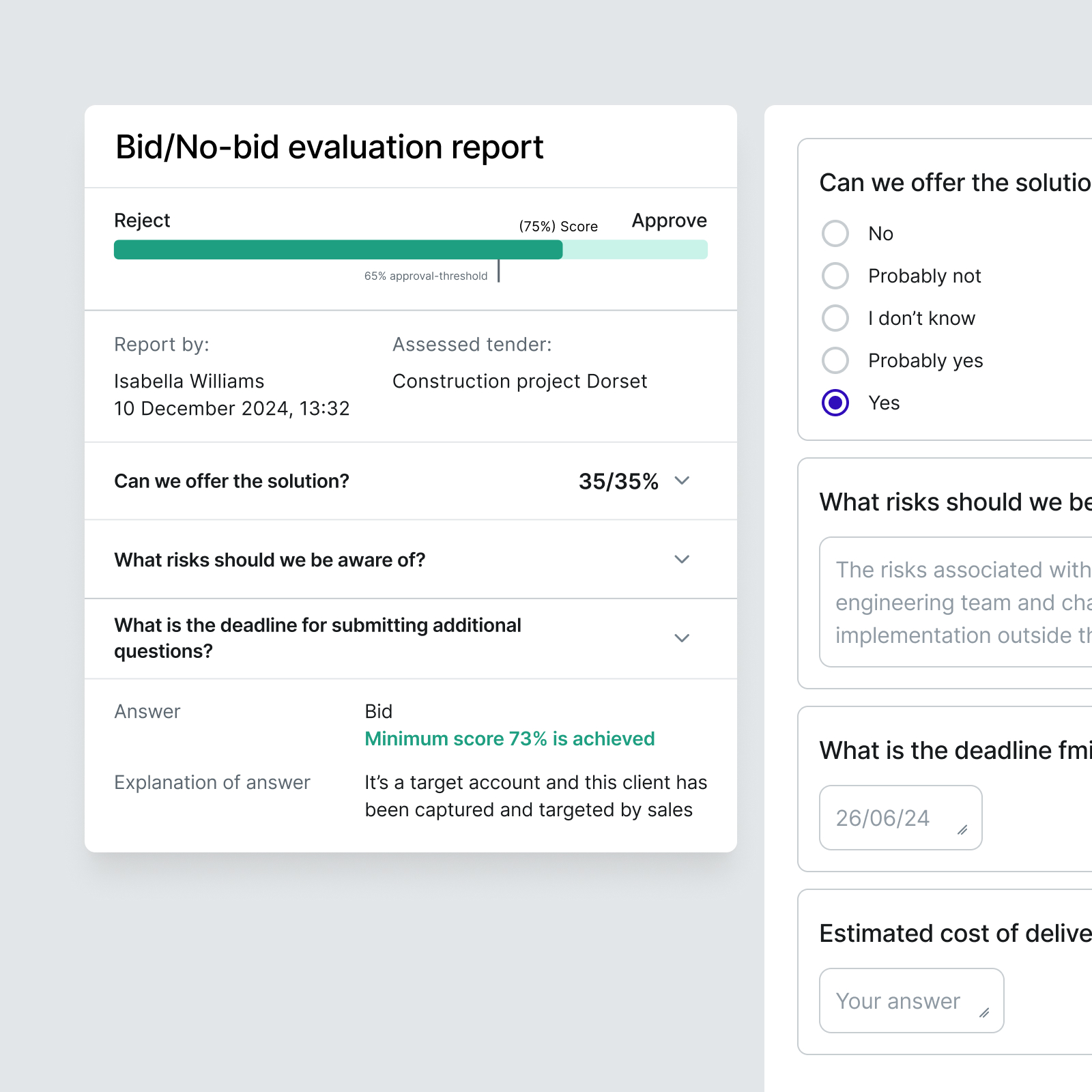 Aethon gained a forward-looking tender calendar with Altura, cutting search time in half and saving ~4 hours weekly. AI tools surface high-scoring past answers, while bid/no-bid scoring keeps the team focused on winnable pursuits.
